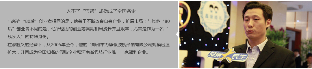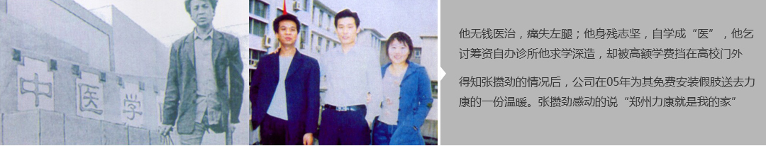 鄭州市力康假肢矯形器有限公司(簡稱力康),是一家專業從事假肢矯形器的設計、研發(fā)、制作及裝 配的專業機構。成立于1992年是河南省唯一一家福利企業。力康下設業務部、技術部、住院部、康復 部、售后服務部,并配有現代化的裝配車間和功能齊全的訓練大廳,為殘疾朋友康復訓練提供了可靠 保障??偨浝泶┐骷僦嗄辏兄S富的臨床經驗和親身體會;多年來,力康已為全國幾十萬名殘疾 朋友安裝上舒適、美觀、耐用的假肢和矯形器具,使他們更大限度地恢復了正常的工作和生活?!爱a 品即人品”的質量理念、先進的技術、實惠的價格、完善的售后服務是力康取勝的法寶……
